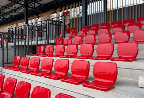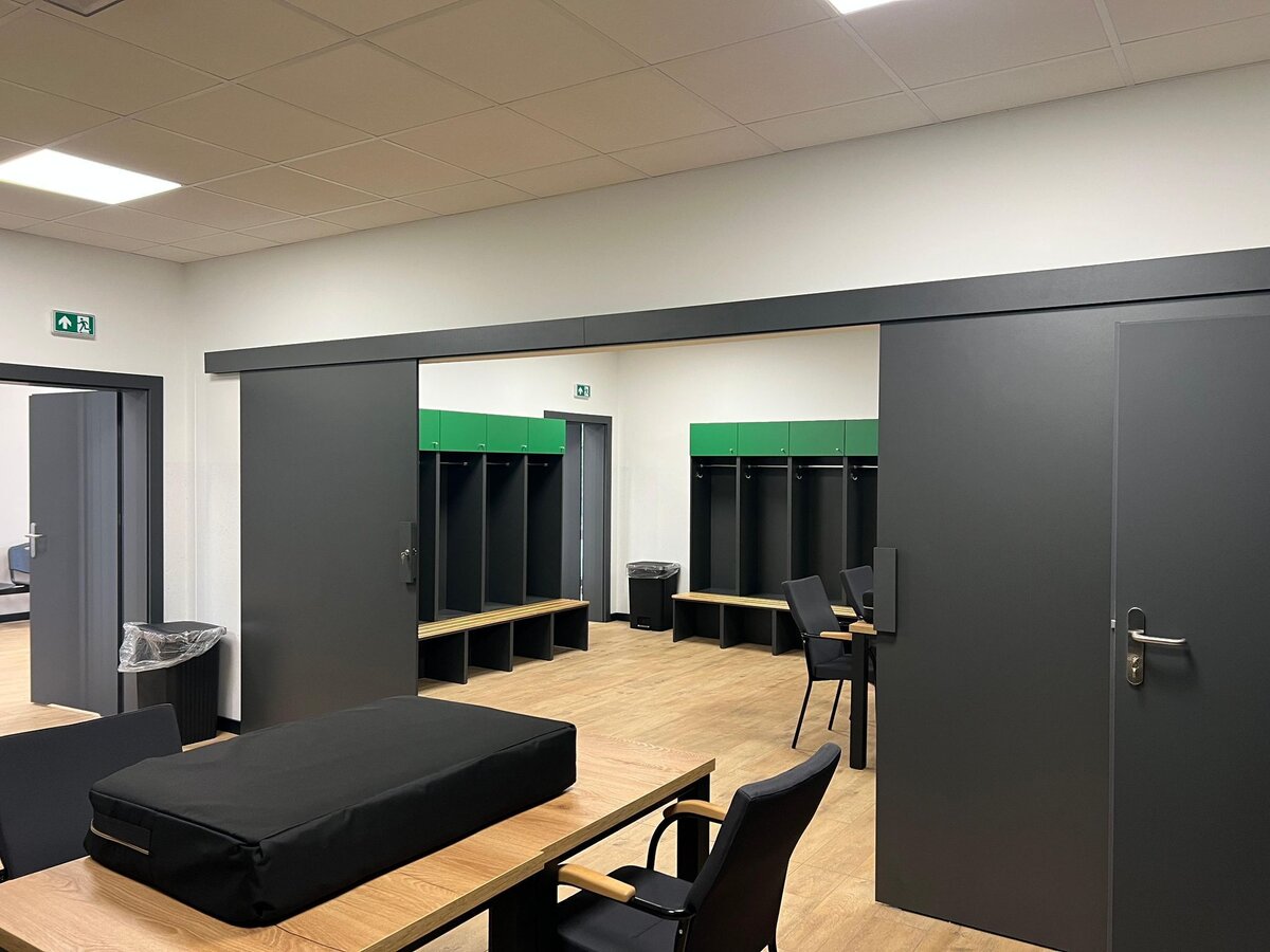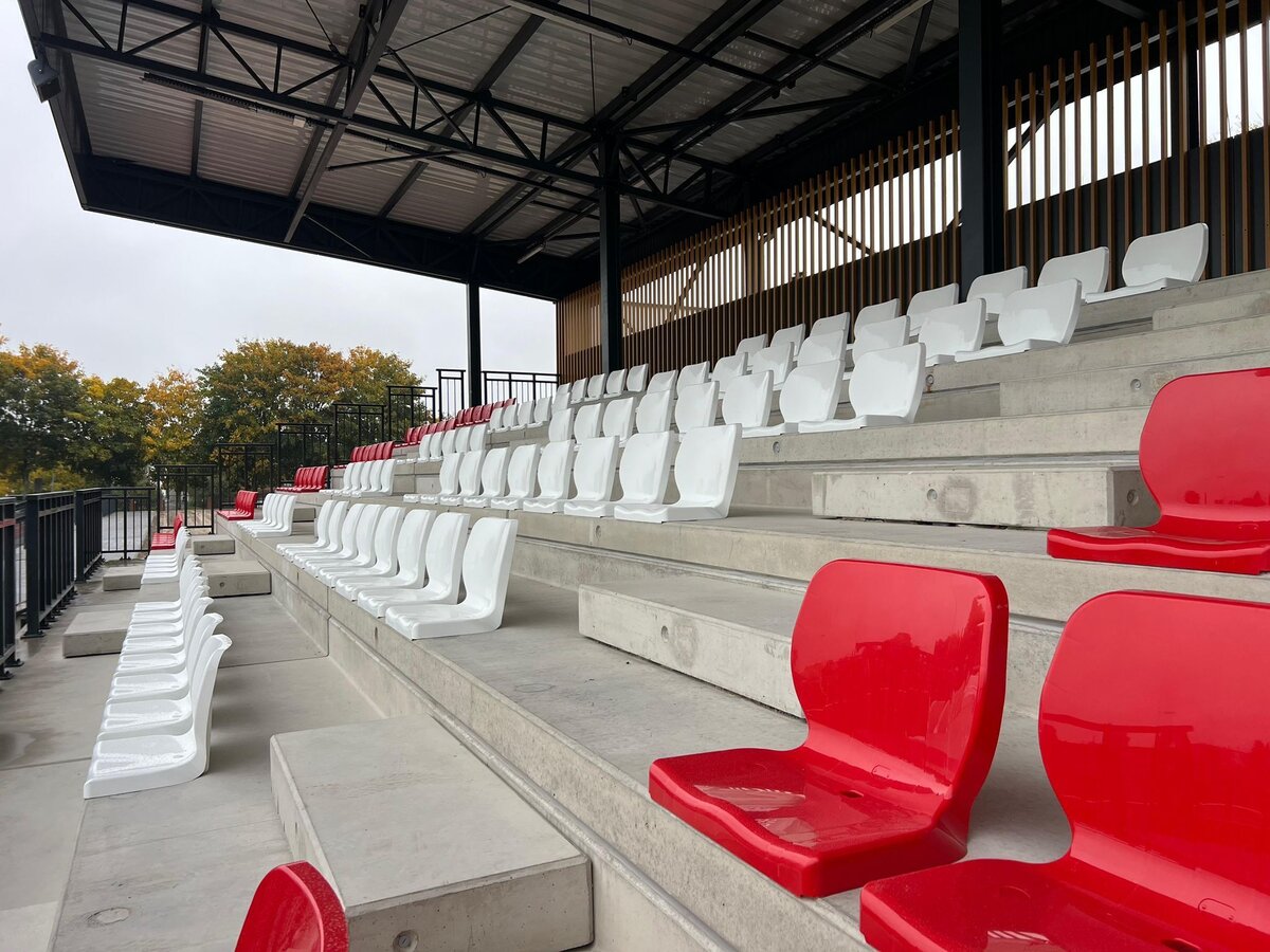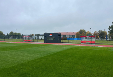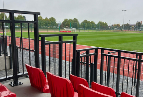 Bezpośrednio przy płycie stadionu znajduje się budynek szatniowy, do którego przylegają trzy zadaszone trybuny oferujące łącznie 314 komfortowych miejsc siedzących. Wewnątrz zaplecza zaprojektowano przestronny korytarz, salę konferencyjną, biuro, cztery szatnie dla zawodników oraz osobną szatnię dla sędziów. Wszystkie pomieszczenia wyposażone są w pełne zaplecze sanitarne obejmujące łazienki i prysznice. Dodatkowo dla kibiców przygotowano toalety dostępne podczas wydarzeń sportowych.